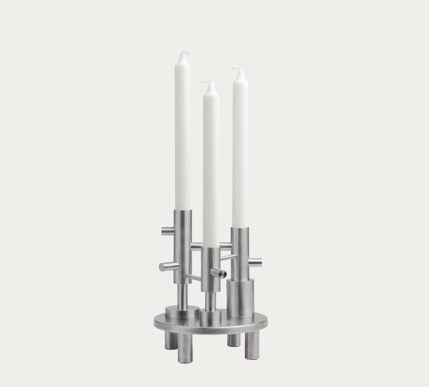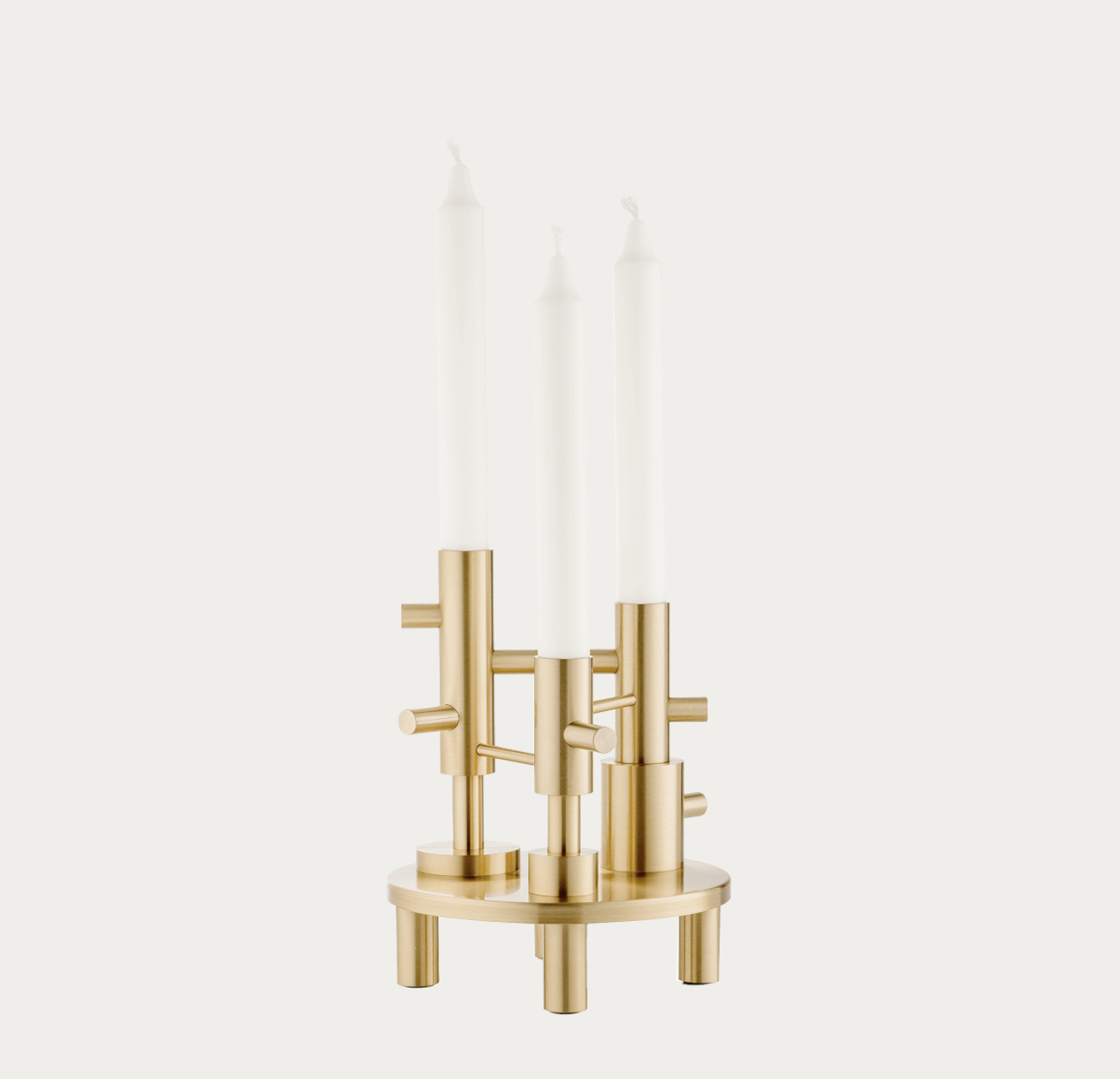 A new interpretation of the classical chamber candle holder, this design forms a display of light and warmth with golden brass and a sculptural quality. Simply elegant and beautiful alone, or arranged in a group. The larger Candle holder in the collection by Jaime Hayon is both sculptural and decorative.