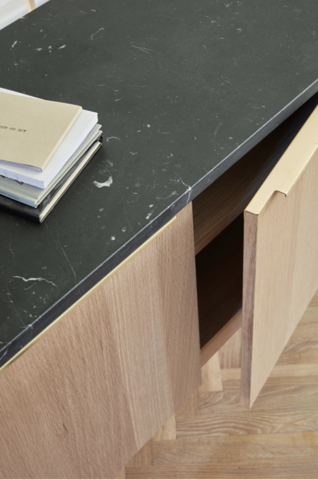 Jut is a cabinet series that exudes a graceful contemporary expression. A practical storage piece, its slim legs and subtle curves underline the elegance of this modern piece of furniture. Designed in collaboration with Norway-based British designer, Thomas Jenkins. A contemporary Nordic cabinet for the living room and hallway. The long, round legs are positioned at the outer corners and the refined brass handles on the cabinet doors are aligned with the tabletop. The left room is empty while the rooms on the mid and right are each divided by a removable shelf. The tabletop comes in either oak or marble – both materials known for their beautifully vivid structures.